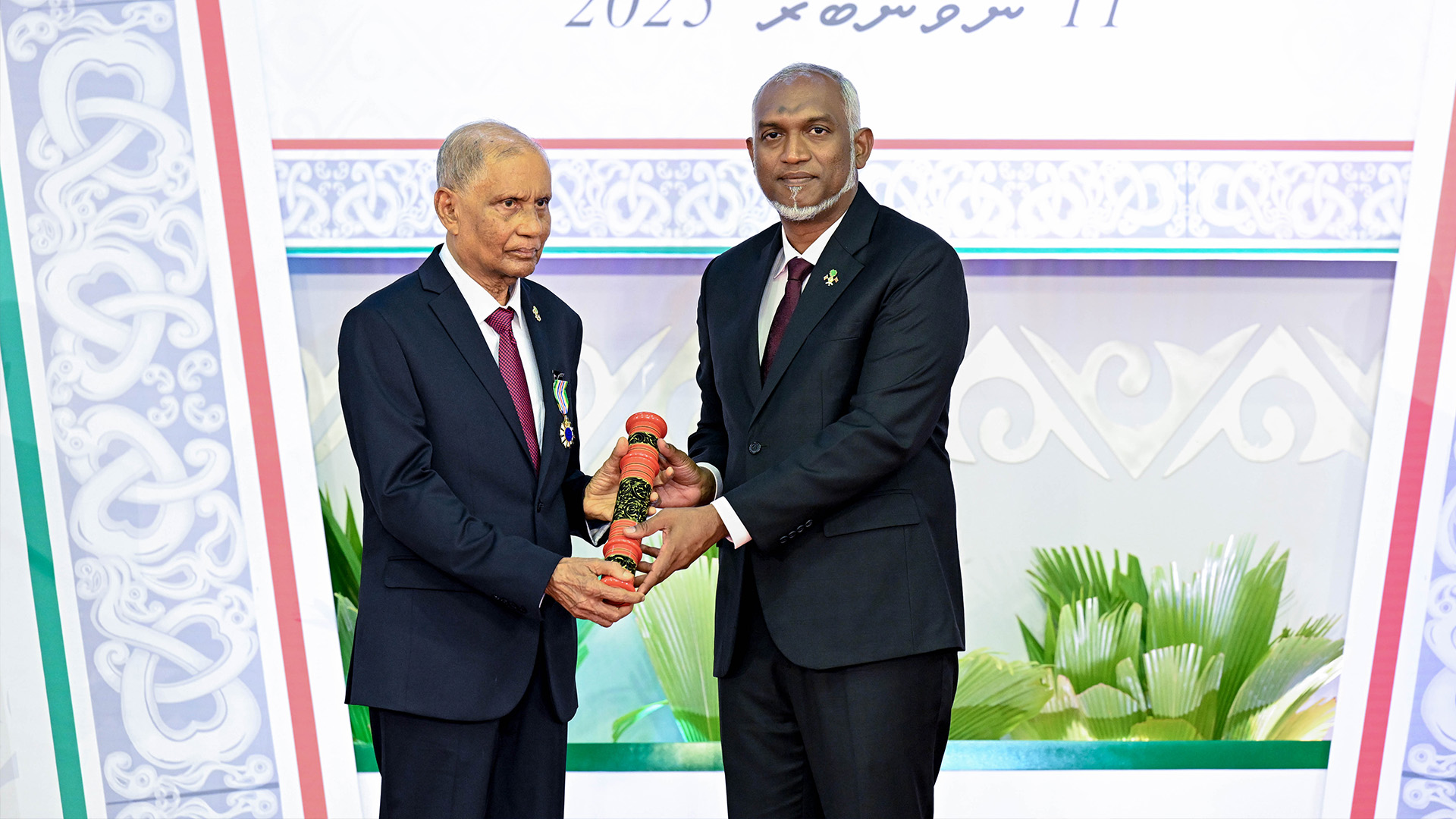 ރައީސުލްޖުމްހޫރިއްޔާ ޑޮކްޓަރ މުޙައްމަދު މުޢިއްޒު، ދިވެހިރާއްޖޭގެ ވިޔަފާރި އާއި އިޤްތިޞާދު ފުޅާކުރައްވައި، ކުރިއެރުއްވުމުގެ އެންމެ އިސް ސަފުގައި ހިމެނިވަޑައިގަންނަވާ، މ. ޝުއާޒް، މުޙައްމަދު ޞާލިޙަށް، ނިޝާން މުލީގޭ ޝަރަފުގެ ޢިއްޒަތް (ނ.މ.ޝ.ޢ) އަރުވައިފިއެވެ. ޞާލިޙަށް މި ޢިއްޒަތް އަރުވާފައިވަނީ، ޒުވާނުންގެ މަރުކަޒުގައި މިއަދު ހެނދުނު ބޭއްވި، ޖުމްހޫރީ ދުވަހުގެ ރަސްމީ ޖަލްސާގައެވެ.