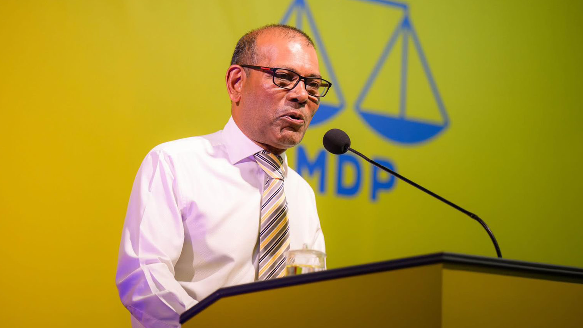 The stage instead featured party leadership and newly elected figures, including MDP President Abdulla Shahid, Chairperson Abdul Gafooru Moosa, five victorious mayoral candidates, and Women’s Development Committee (WDC) representatives from the five cities.